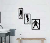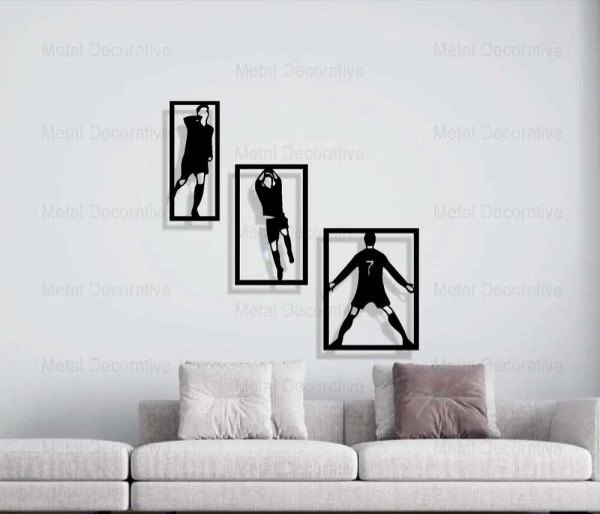 تابلو دیواری فلزی سه تکه رونالدو شادی بعد از گل مناسب برای استفاده در دکوراسیون اتاق خواب کودک و نوجوان و گیم نت می باشد. این تابلو از ورق فلزی و توسط دستگاه برش لیزر تولید شده و سپس در کوره های رنگ با انواع رنگ های مشکی ، سفید و طلایی قابل تولید هستند . نصب این تابلو بسیار آسان می باشد و به راحتی با استفاده از دو عدد پیچ و رولپلاک سایز متوسط می توانید روی دیوار نصب کنید