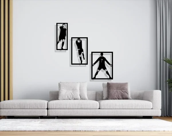 تابلو دیواری فلزی سه تکه رونالدو شادی بعد از گل مناسب برای استفاده در دکوراسیون اتاق خواب کودک و نوجوان و گیم نت می باشد. این تابلو از ورق فلزی و توسط دستگاه برش لیزر تولید شده و سپس در کوره های رنگ با انواع رنگ های مشکی ، سفید و طلایی قابل تولید هستند . نصب این تابلو بسیار آسان می باشد و به راحتی با استفاده از دو عدد پیچ و رولپلاک سایز متوسط می توانید روی دیوار نصب کنید