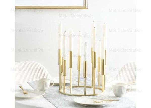 جاشمعی طلایی چند شاخه با شمع های سفید روشن، نور گرم و ملایمی را در فضای دنج و مدرن اتاق غذاخوری ایجاد کرده است. پایه های برنجی با ارتفاع های مختلف، جلوه ای هنری به میز چوبی بخشیده و فضایی آرام و دعوت کننده برای یک شب دلپذیر فراهم کرده است.