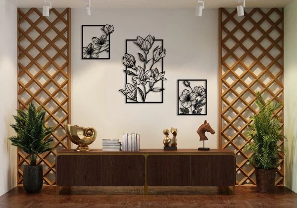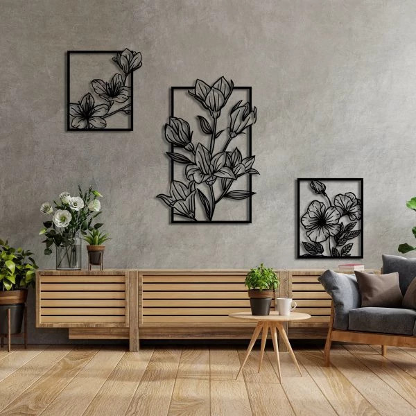 تابلو خطی مینیمال طرح گل سه تکه جهت استفاده در محیط های آموزشی و یا اداری و مسکونی می باشد . این تابلو ها از ورق فلزی و توسط دستگاه برش لیزر تولید شده و سپس در کوره های رنگ با انواع رنگ های مشکی ، سفید و طلایی قابل تولید هستند . نصب این تابلو بسیار آسان می باشد و به راحتی با استفاده از دو عدد پیچ و رولپلاک سایز متوسط می توانید روی دیوار نصب کنید .