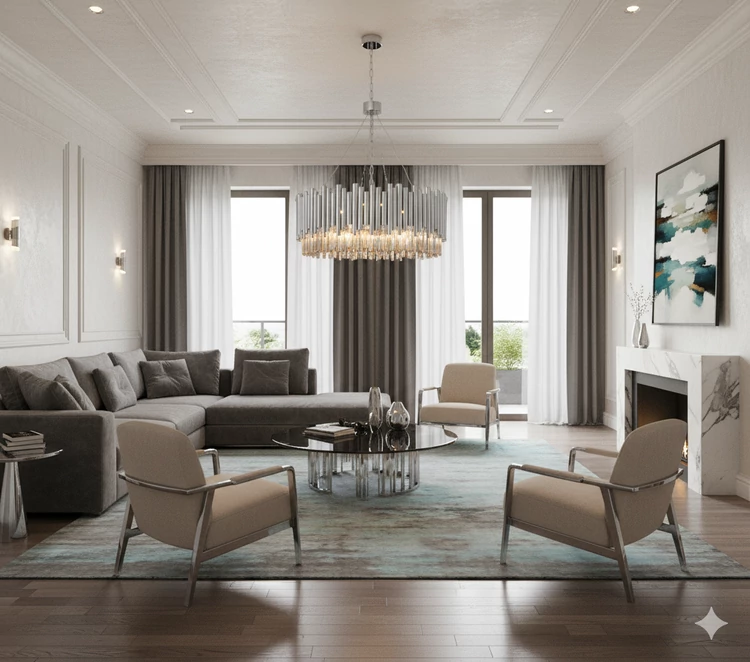 پذیرایی اصلی: در مرکز اتاقهایی با دکوراسیون نئوکلاسیک یا مدرن مجلل.