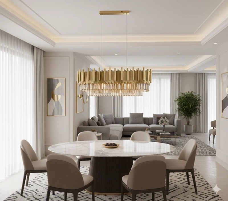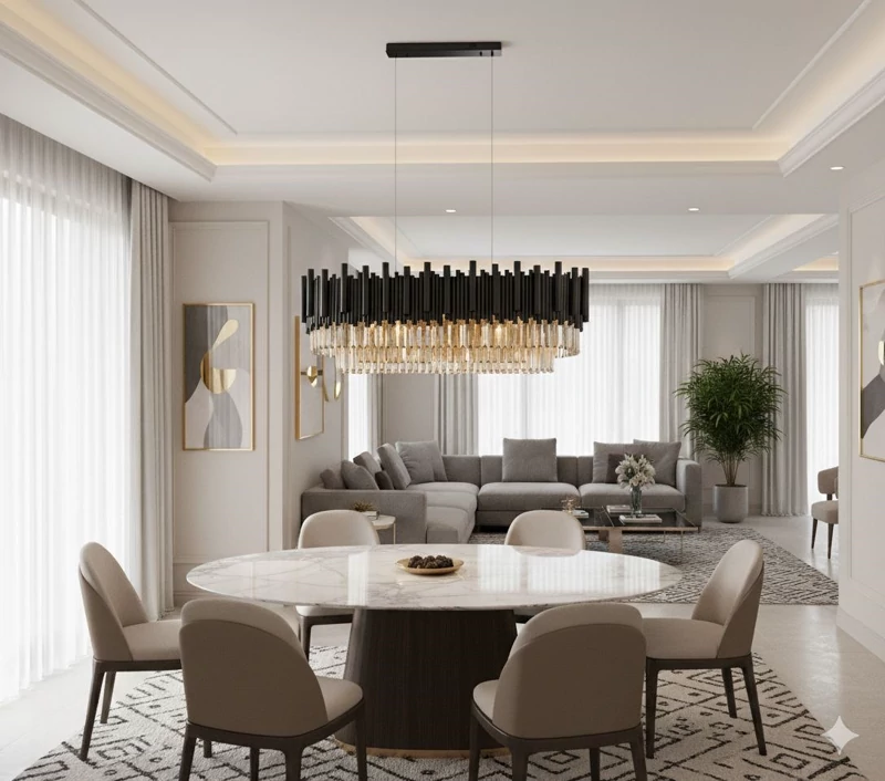 لایه بالایی از میلههای عمودی برنجی/طلایی تشکیل شده که بافت غنی و گرمی ایجاد میکند. لایه زیرین، از هزاران قطعه کریستال تراشخورده ساخته شده که نور را به زیباترین شکل ممکن منعکس کرده و فضا را غرق در درخشش میکند. این لوستر برای مجالس بزرگ، پذیراییهای مجلل و میزهای شام رسمی طراحی شده است