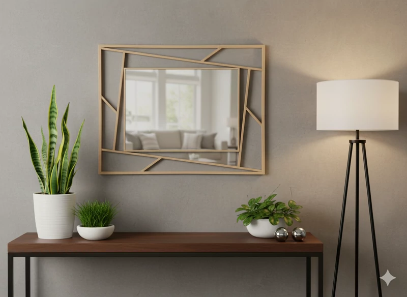این آینه یک قطعه دکوراتیو بسیار جذاب و مدرن است که بیشتر از اینکه صرفاً یک آینه کاربردی باشد، حکم یک اثر هنری روی دیوار را دارد.